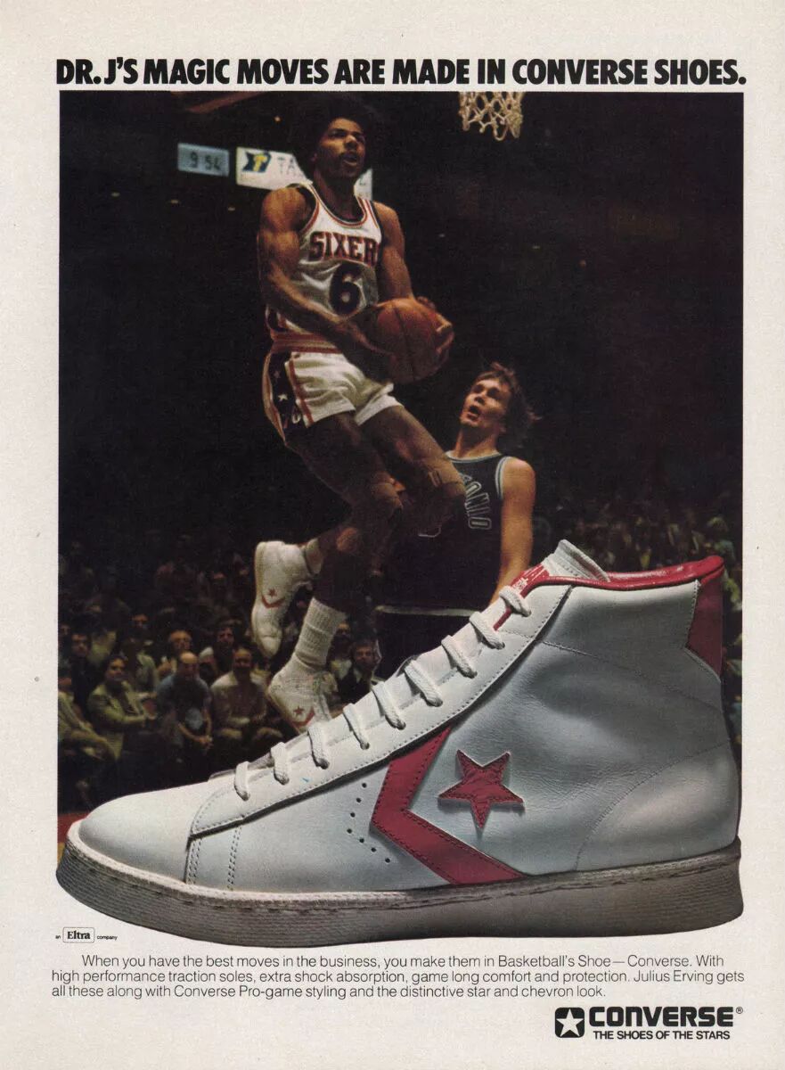 All Star Chuck Taylor和它的故事,都足够伟大,并且它犹如一盏明灯,时刻提醒着世人Converse在篮球鞋领域的不朽成就。但对于中国消费者而言,那些存在于黑白影像中的故事,犹如Wilt Chamberlain的百分神话一样,如雷贯耳,却多少有些难以逾越的距离。所以有关Converse在篮球鞋领域的故事,我们青春中的画面,还是要从“彩色电视”时代开始。譬如这双诞生于1976年,属于Dr.J的Pro Leather。
