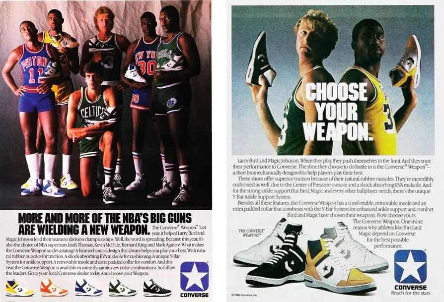 所谓全盛,在篮球鞋的领域中并不难理解,那便是让最好的球员,穿上自家最好的产品。这样的理念在1986年的Weapon身上得到了极致的演绎。包括“黑白双雄”在内,当时NBA中所有顶尖球员,几乎都签约于Converse旗下,并且选择Weapon作为自己在赛场上的“武器”。