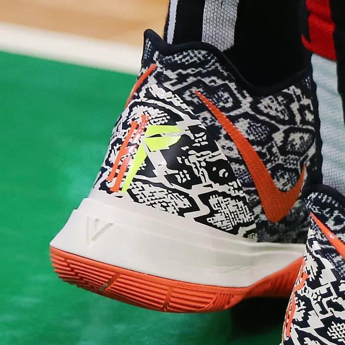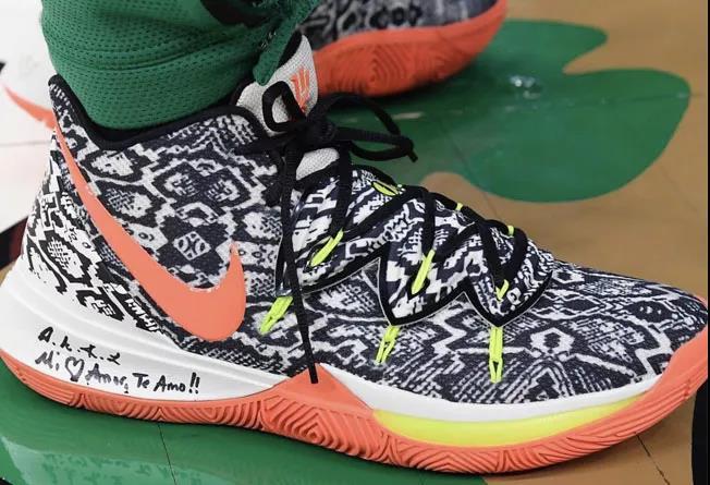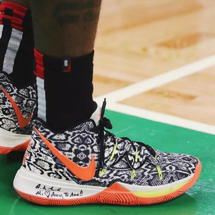 继此前科比曼巴日 Nike 推出市售版本的 Kyrie 5 与 PG 3 后,欧文今早上脚了一双科比主题的 PE 特殊配色,不仅鞋面采用蛇皮纹理示人,后跟更将个人 Logo 与科比武士标志相融合,让人过目不忘!