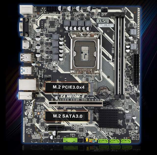 艾尔莎H610M-E是一款基于H610芯片组所打造的M-ATX规格主板,它采用了消光黑+白色条纹装饰的PCB设计,CPU方面可以支持12代LGA1700的酷睿、奔腾、赛扬处理器,供电方面提供了1上2下八爪鱼MOS管的7+1相供电,接口和插槽方面更是提供了DDR4*2、PCIe 4.0 x16*1、PCIe x1*1、M.2*2(NVMe+SATA,最大2280长度)、SATA 3.0*3、PS/2键鼠口*2、VGA*1、HDMI*1、USB 2.0*4、USB 3.0*2、千兆LAN口*1和3.5mm音频口*3,其中内存与第一条显卡槽还有合金装甲的设计,拔插寿命和电气性能要比一般的主板更好,非常适合想要装游戏配置的朋友入手。